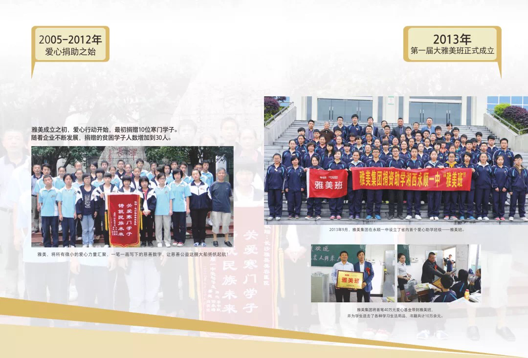 捐资助学无止境,大爱之情伴此生。十四年,每年三次深入湘西贫苦地区走访;每年50余万专项资金;2个(3届)“雅美班”,406名湘西贫困学子;60多位社会爱心人士,17次慈善捐助活动,累积筹集善款600余万元。常怀善心,常行善举,雅美大爱,一直在路上。