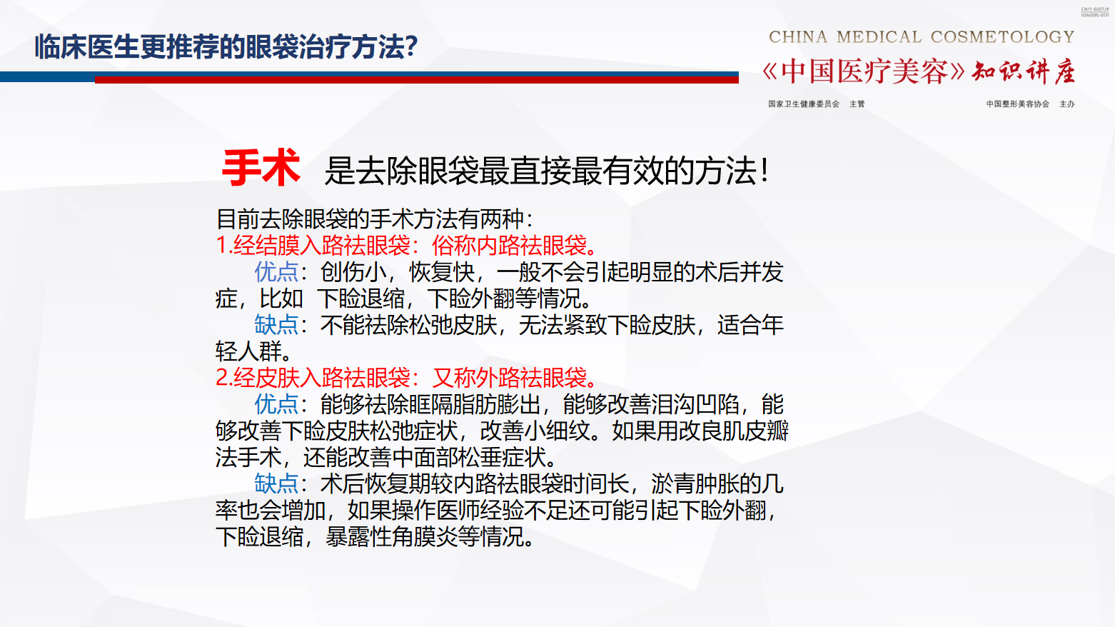 缺点:术后恢复期较内路祛眼袋时间长,淤青肿胀的概率也会增加,如果操作医师经验不足还可能引起下睑外翻,下睑退缩,暴露性角膜炎等情况。