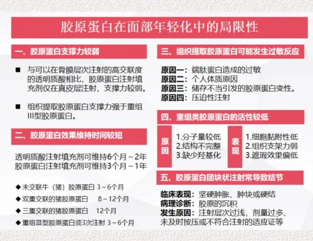 上一讲,我们介绍了胶原蛋白面部年轻化应用,侧重说明了胶原蛋白的优势。但没有材料是全能的,胶原蛋白注射填充剂的应用过程中也出现了一些问题,今天是我们的第三讲《胶原蛋白在面部年轻化中的局限性》。我将从5个方面和大家展开分享: