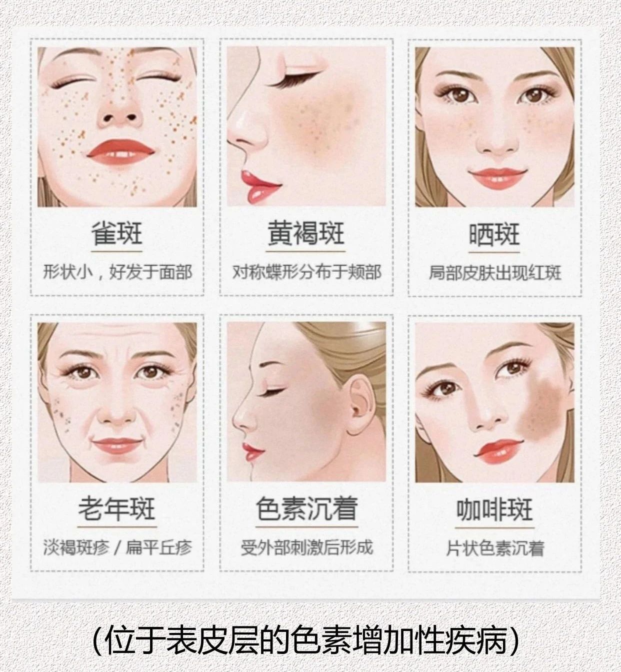 皮肤由浅入深,分为表皮层、真皮层、皮下组织。位置深一点的、发生在真皮层色素增加性疾病,有颧部褐青色痣、太田痣等。但我们今天讨论的,是普通求美者更常见的、位置稍浅的、位于表皮层的色素增加性疾病,如雀斑、黄褐斑、咖啡斑、老年斑等。